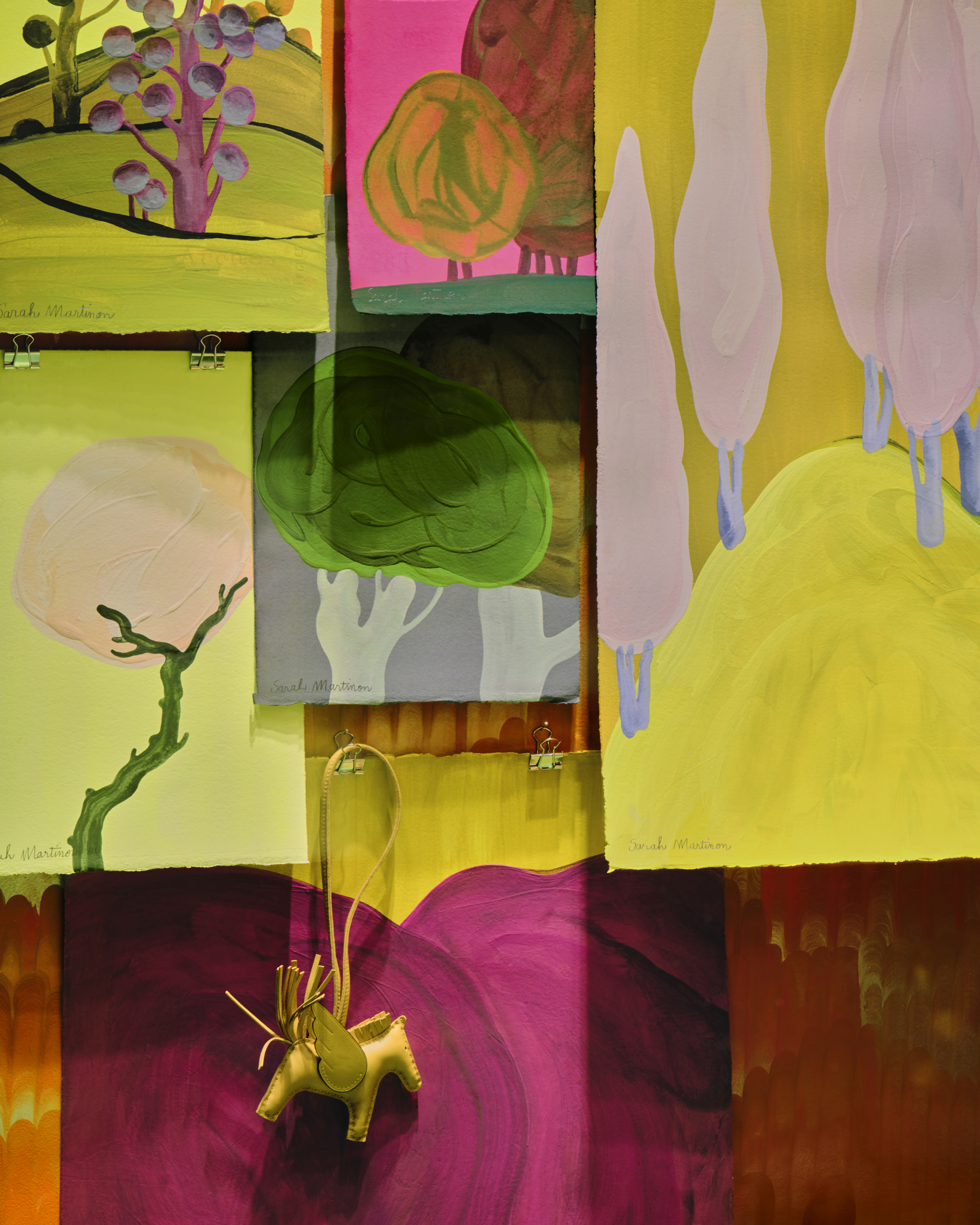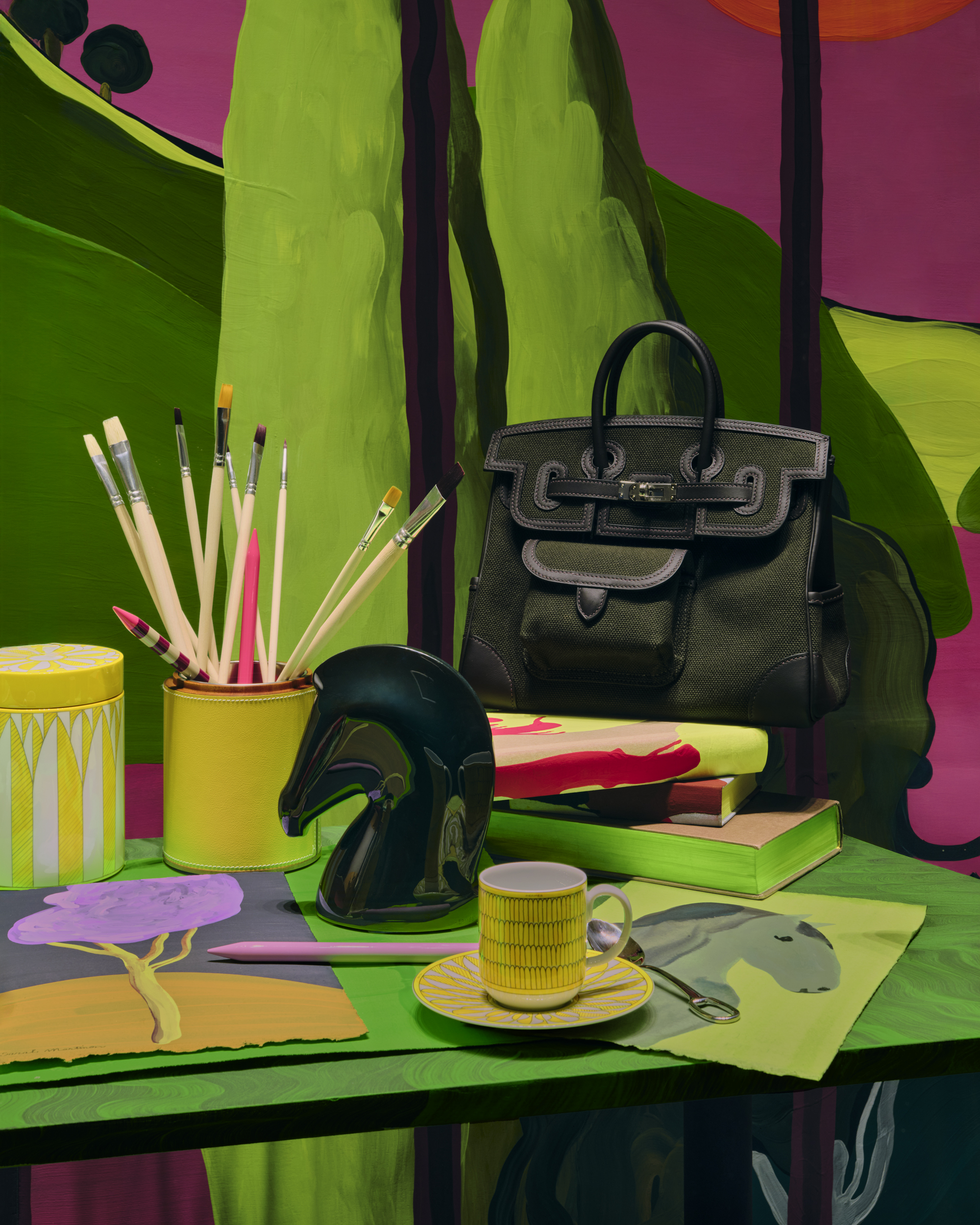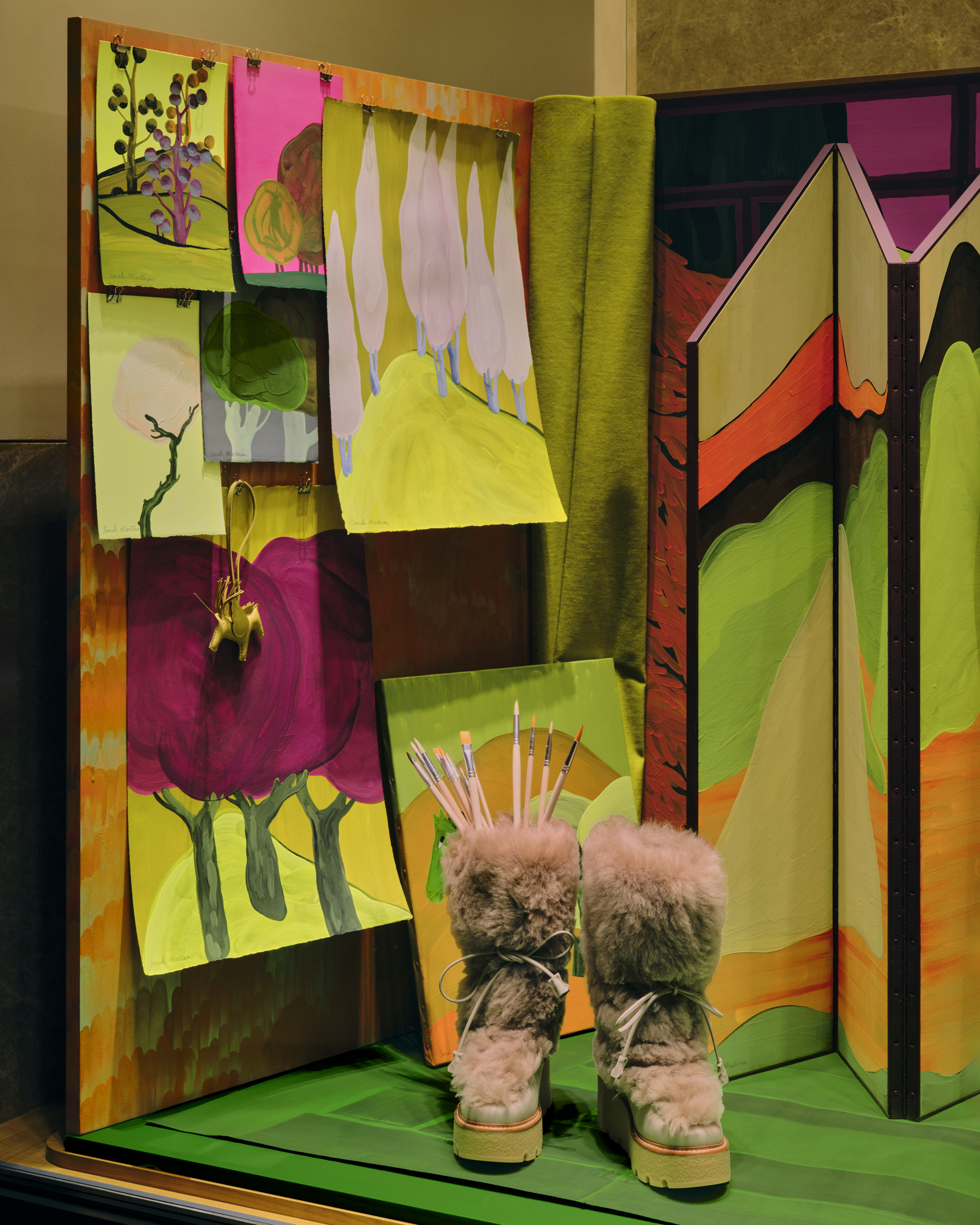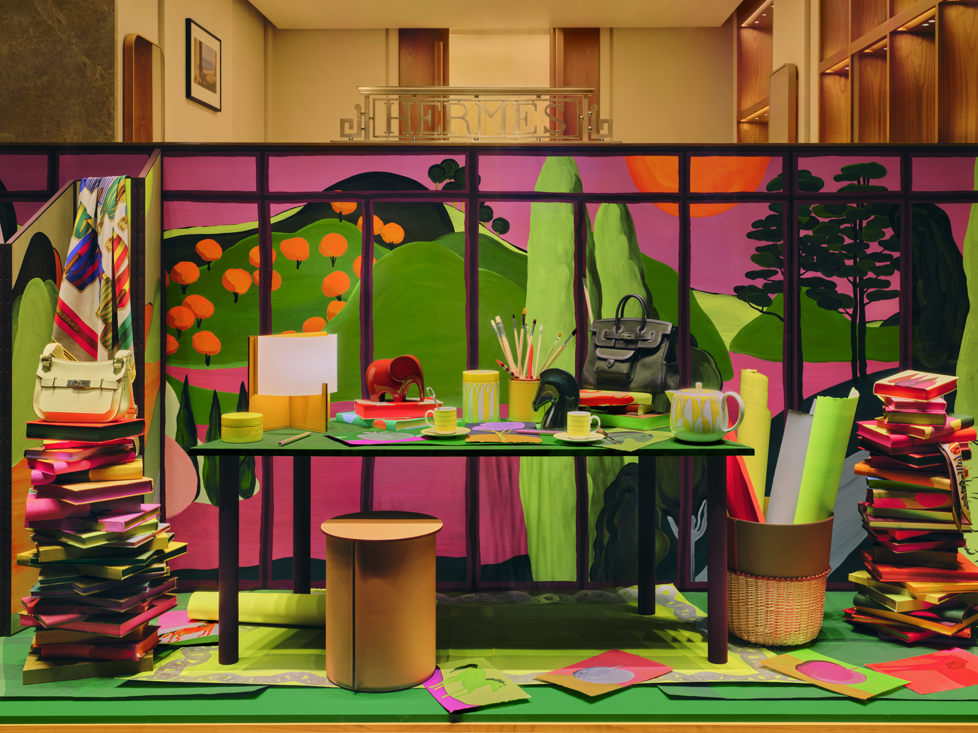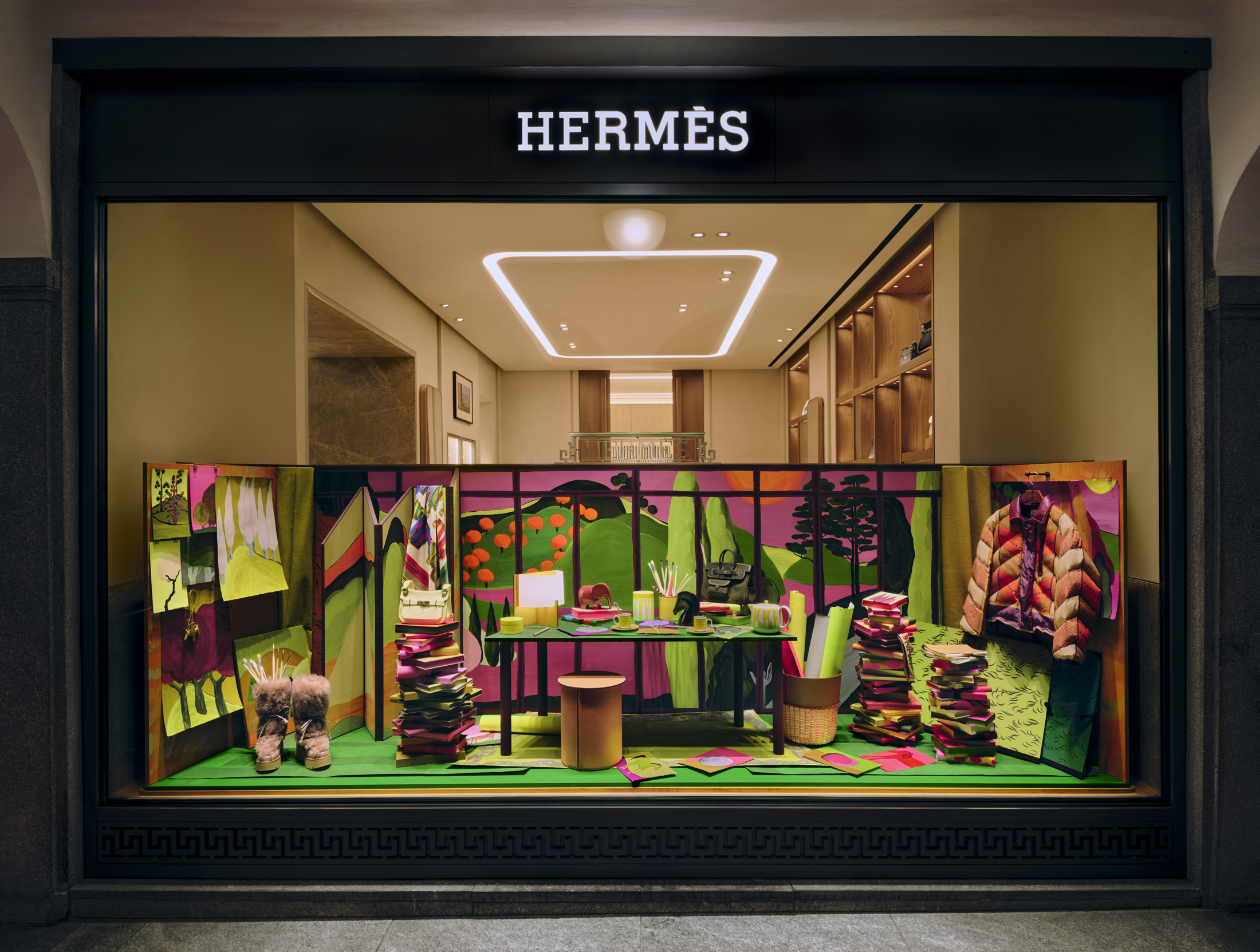 HERMÈS ARTIST'S STUDIO WITH A VIEW LUGANO WINDOW DISPLAY AND ORIGINAL PAINTINGS DECEMBER 2025